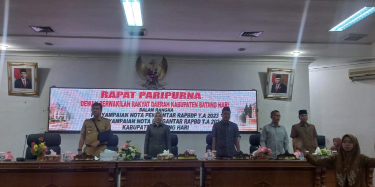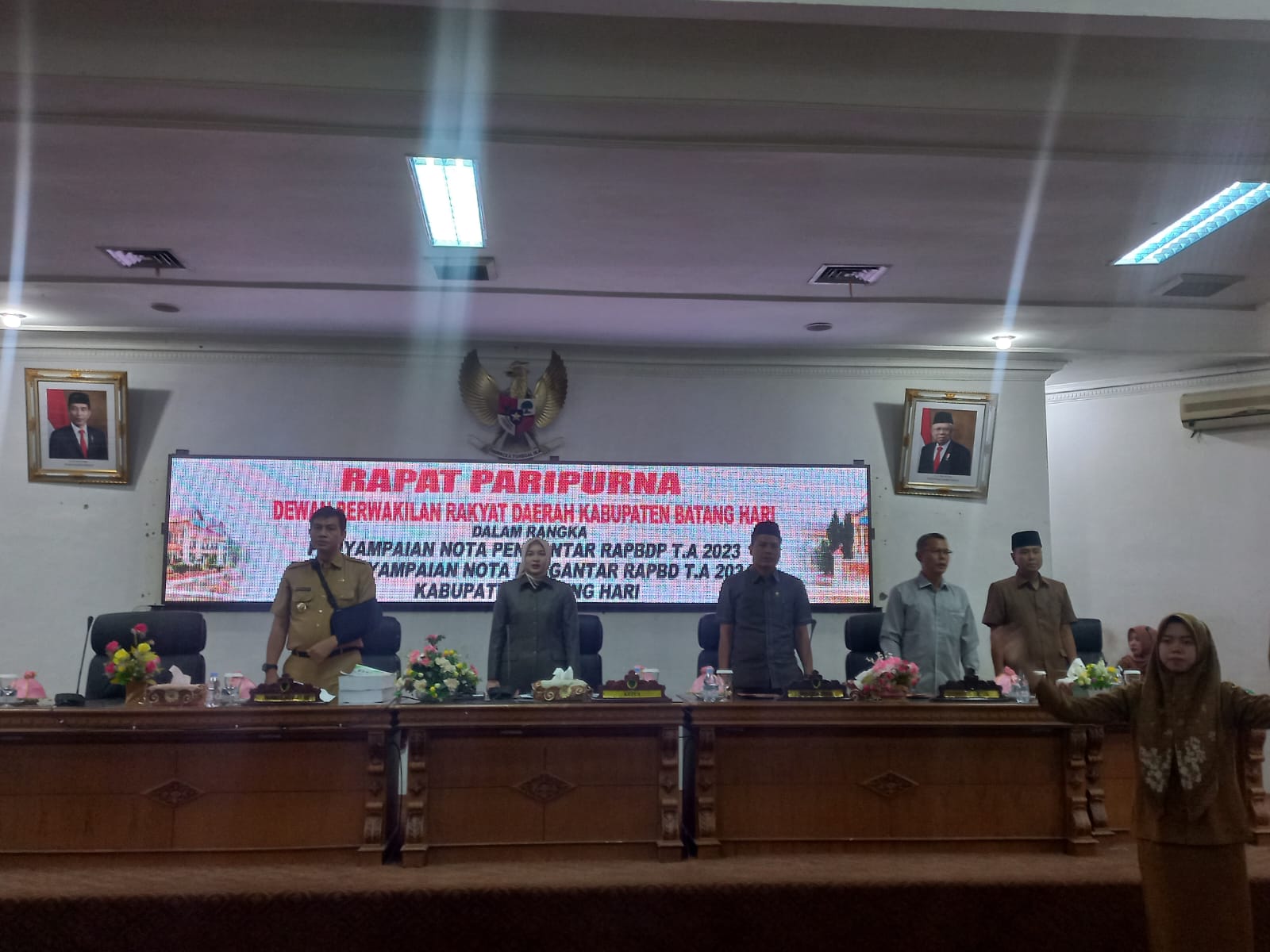 “Berdasarkan peraturan perundang-undangan yang dimaksud sebagai dasar daripada penyusunan APBD Kabupaten Batanghari perubahan tahun 2023 sesuai dengan surat Bupati Batanghari nomor 910/028/TAPD/2023 tanggal 22 September 2023 perihal penyampaian rancangan perubahan anggaran pendapatan dan belanja daerah Tahun Anggaran 2023 juga surat Bupati Batanghari nomor 910/025/TAPD/2023 perihal penyampaian rancangan anggaran pendapatan belanja daerah Tahun Anggaran 2024 Kabupaten Batanghari,” ujarnya.