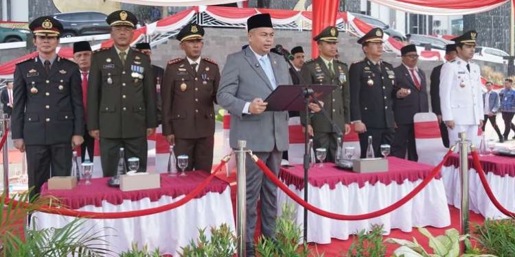 Ribuan peserta yang hadir, mulai dari jajaran pemerintah daerah, TNI-Polri, hingga masyarakat umum, tampak khusyuk mendengarkan.